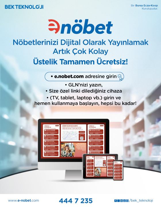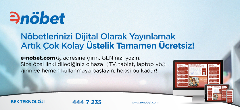 www.e-nobet.com adresi üzerinden GLN numarası ile kolayca kayıt olunabilen e-nöbet, ücretsiz olarak sunduğu tüm ayrıcalıklarla eczacıları, hızlı ve güvenilir nöbet ve eczane duyuru yönetim sistemine davet ediyor.
