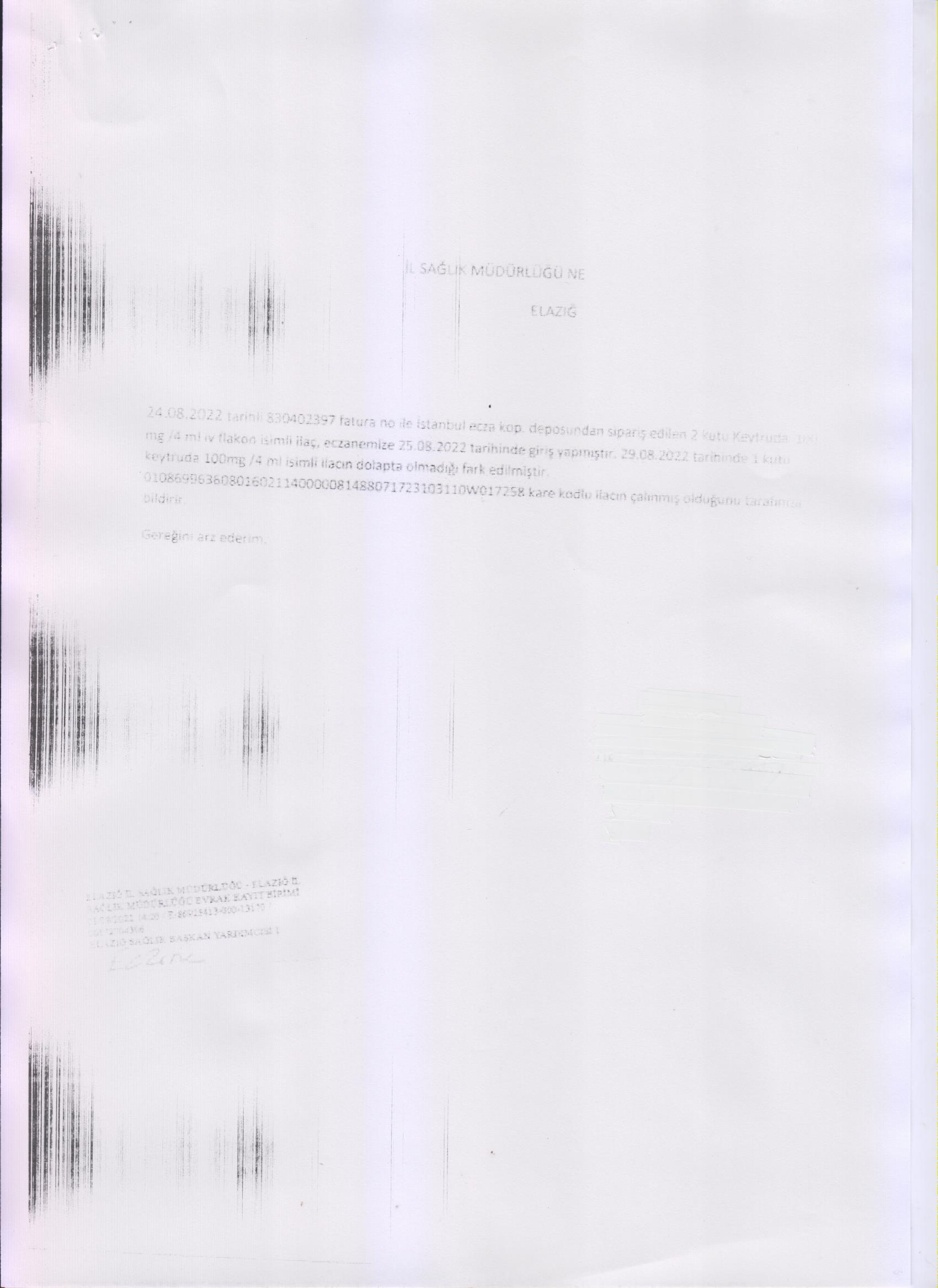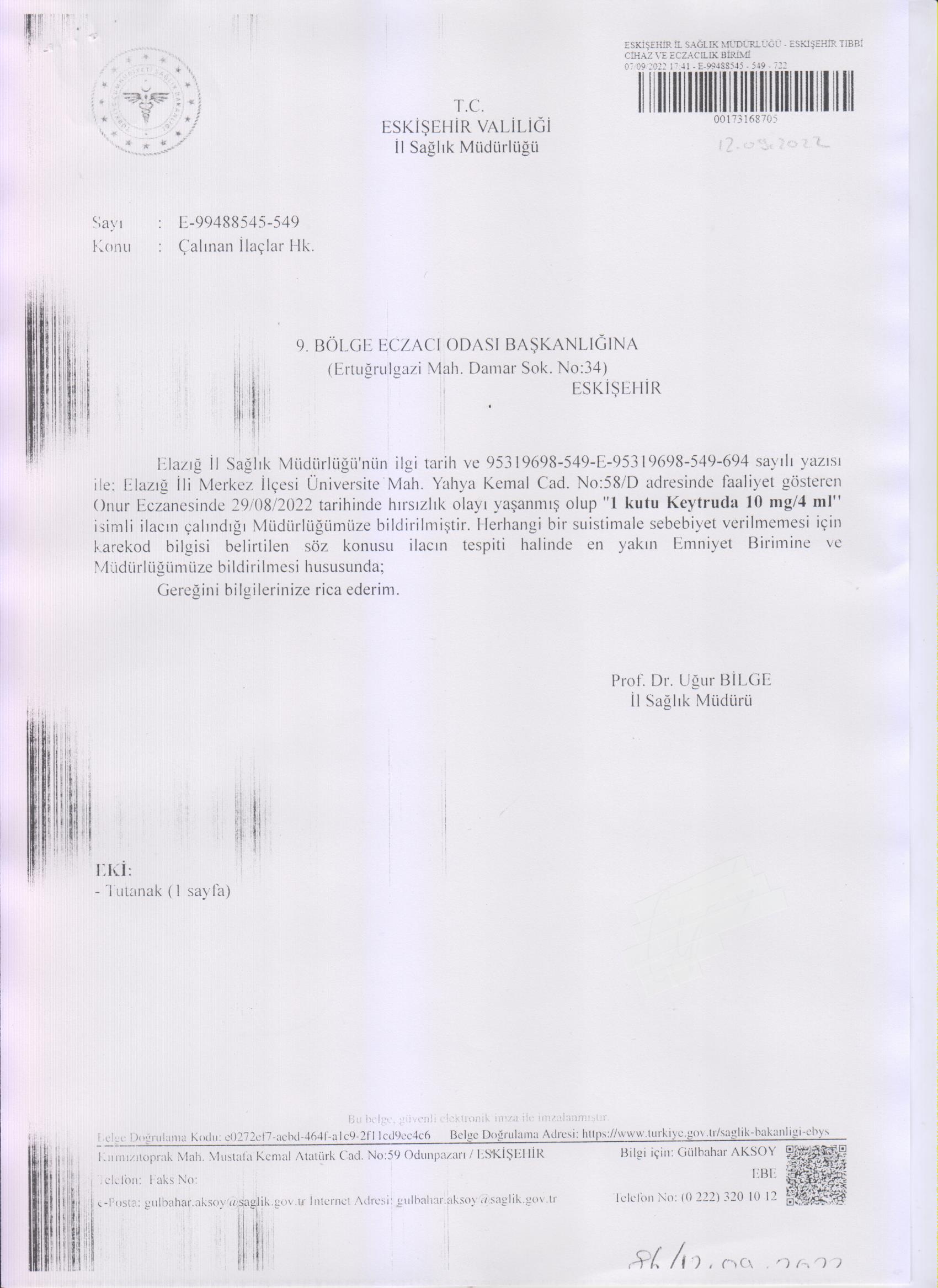 İl Sağlık Müdürlüğü’nden gelen 07/09/2022 tarih E-99488545-549-722 sayı ile gelen “Çalınan İlaçlar” hakkındaki yazı ektedir.