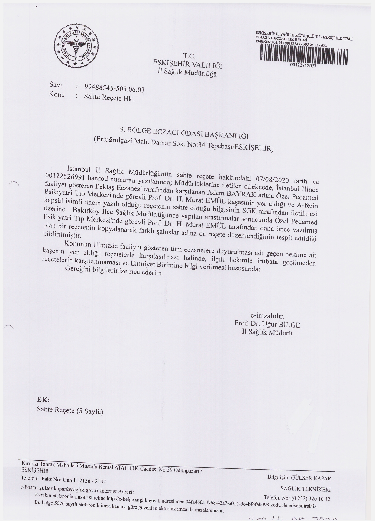 Eskişehir İl Sağlık Müdürlüğü’nden 13.08.2020 tarih 99488545/ 505.06.03/ 632 sayı ile gelen “Sahte Reçete” hakkındaki yazı aşağıda bilgilerinize sunulmuştur.