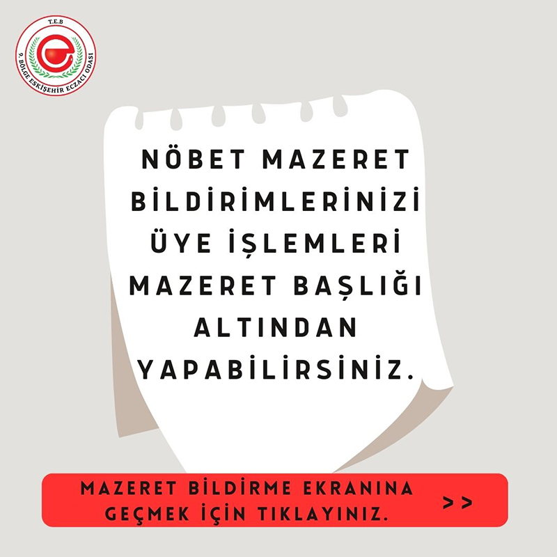 - Nöbet mazeret dilekçelerini ise oda web sayfamızın üye işlemleri bölümündeki "NÖBET MAZERET DİLEKÇESİ" başlığı altından sisteme girmesi gerekmektedir.