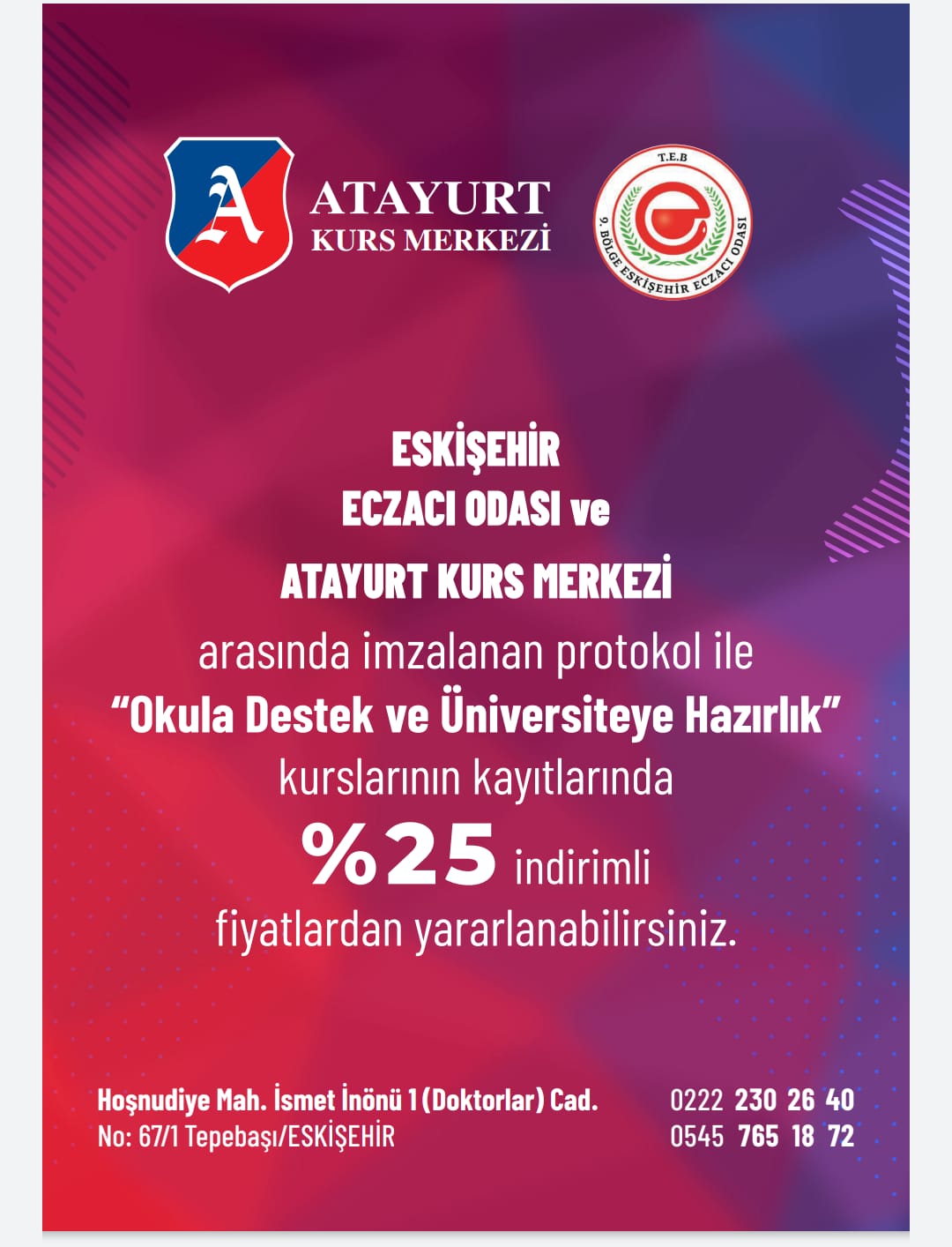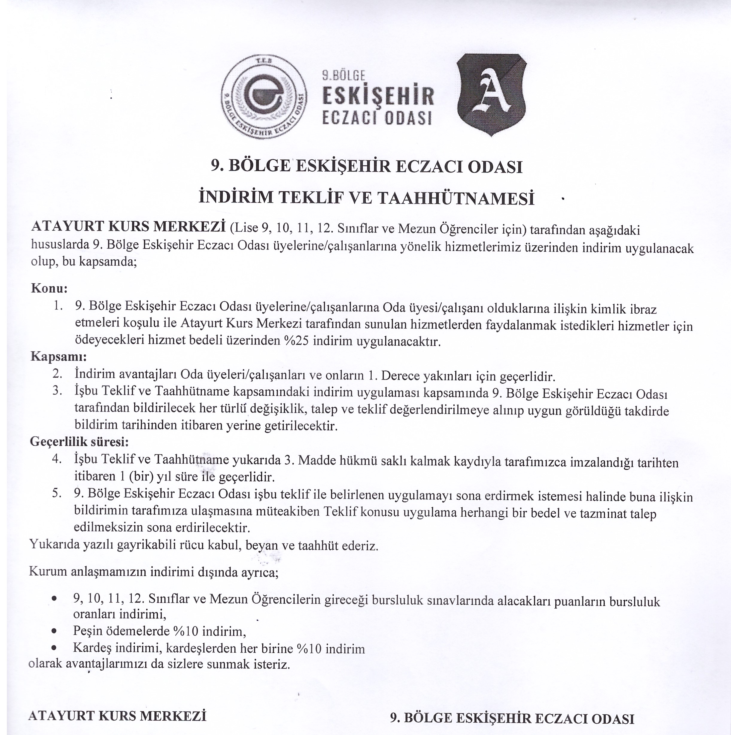 Odamız ile Özel Atayurt Kurs Merkezi arasında yapılan anlaşma Odamız üyelerine indirim imkânı sağlanmıştır.