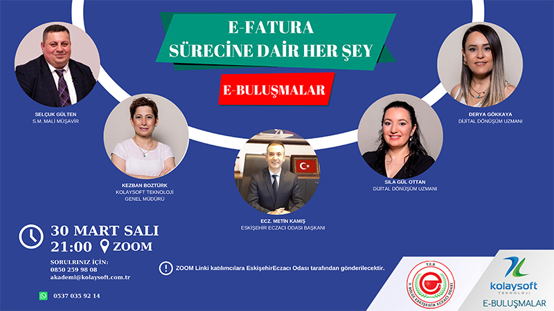 Biz eczacıların da içinde bulunduğu meslek gruplarına 01.07.2021 tarihi itibariyle e-faturaya geçme zorunluluğu getirilmiştir. Bu konu ile ilgili Odamız ve Kolaysoft işbirliği ile 30 Mart 2021 Salı günü saat 21.00 de bilgilendirme toplantısı yapılacaktır.