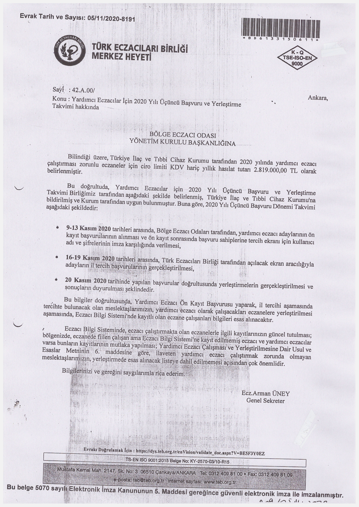 Türk Eczacıları Birliği'nden 05.11.2020 tarih 8191 sayı ile gelen “Yardımcı Eczacılar İçin 2020 Yılı Üçüncü Başvuru ve Yerleştirme Takvimi” hakkındaki yazı ektedir.